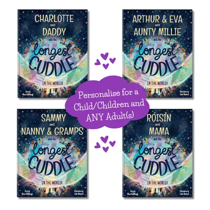 A heartwarming, rhyming story to share together! Personalise “The Longest Cuddle in the World!” to feature a child and adult (parent/grandparent/aunt etc.) or siblings. Also include five or more Family Members, the child’s Teacher/Favourite Character and the child’s Hometown.
