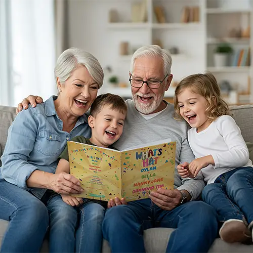 Simply personalise “What’s That??!!” – your silly personalised children’s book – with 1..2..3…or 4 NAMES which appear on the cover and throughout the story! In fact, it’s wonderful for 1-4 children, or to include Mummy & Daddy, Grandparents or Aunties & Uncles too! With so many ways to personalise, What’s That personalised gift book, it makes a truly unique and thoughtful present.